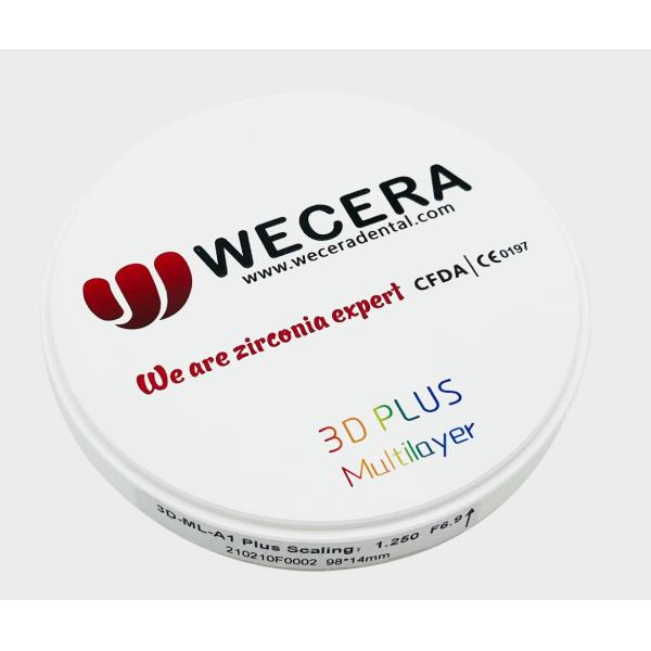 Wecera 3D Plus Multilayer Zirconia Block is made of biological nano zirconia powder 100% from Tosoh with Cold Isostatic Pressing production technology, It is the most natural zirconia in the market, It changes color, strength, and translucency gradually from cervical to incisal part at one zirconia disc.