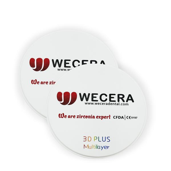 Wecera 3D Plus Multilayer Zirconia Block is made of biological nano zirconia powder 100% from Tosoh with Cold Isostatic Pressing production technology, It is the most natural zirconia in the market, It changes color, strength, and translucency gradually from cervical to incisal part at one zirconia disc.