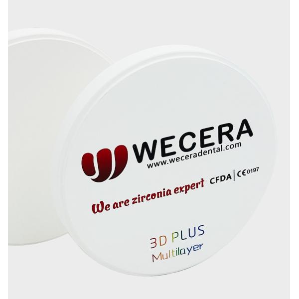 Wecera 3D Plus Multilayer Zirconia Block is made of biological nano zirconia powder 100% from Tosoh with Cold Isostatic Pressing production technology, It is the most natural zirconia in the market, It changes color, strength, and translucency gradually from cervical to incisal part at one zirconia disc.